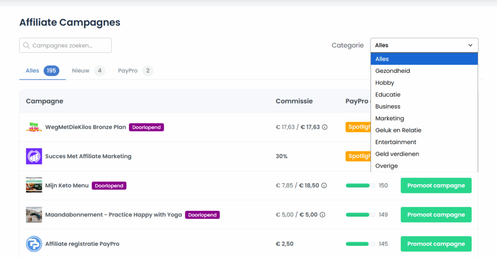 Een van de sterkste punten van PayPro is de campagnes die je kunt promoten. Ze werken samen met adverteerders uit verschillende sectoren, van financiële dienstverlening tot e-commerce, van software tot lifestyle producten. Deze variatie is cruciaal voor het bouwen van een stabiele affiliate business.